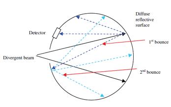 As you can see in this picture, a widely diverging beam enters the aperture of an integrating sphere and bounces around. The unique quality of an integrating sphere is its highly-reflective, scattering coating. This effectively takes the incident beam and spreads it evenly throughout the sphere.